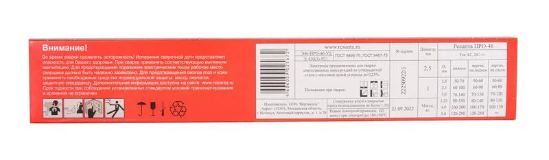 "Электрод Ресанта ПРО-46, Ф2,5 Пачка 1кг, Описание: Сварочные электроды РЕСАНТА предназначены для ручной дуговой сварки стальных конструкций переменным или постоянным током. Данные электроды могут применяться как в быту, так и для сварки ответственных конструкций из углеродистой стали с массовой долей углерода до 0,25%. Сварка возможна в различных пространственных положениях, кроме сварки на спуск. Электрод представляет собой металлический стержень из электропроводного материала, предназначенный для подвода тока к свариваемому изделию.