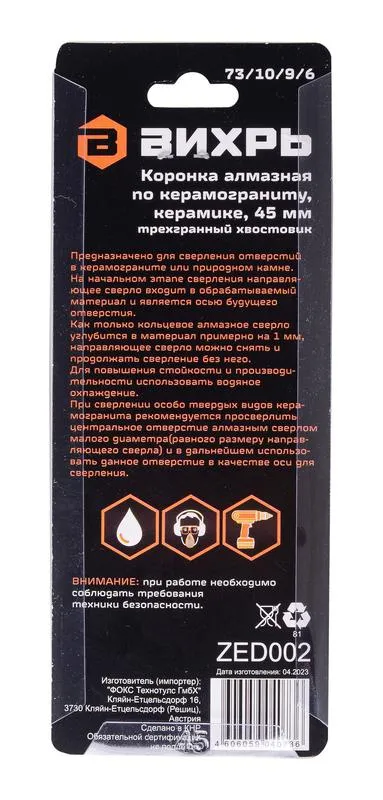| Диаметр центровочного сверла | 45 мм | |