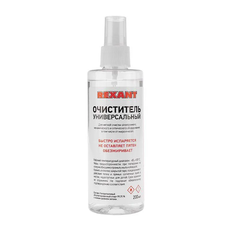 Очиститель универсальный 200 мл (с распылителем) REXANT предназначен для «мягкой» очистки или обезжиривания различных предметов.