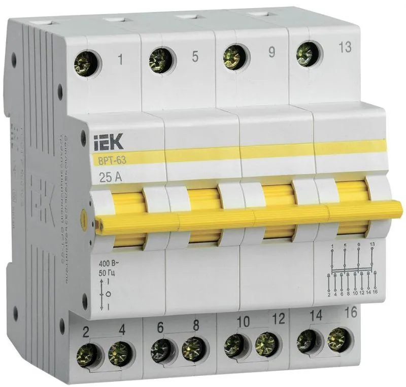 | Наименование производителя | Выключатель-разъединитель трехпозиционный ВРТ-63 4P 25А IEK | |